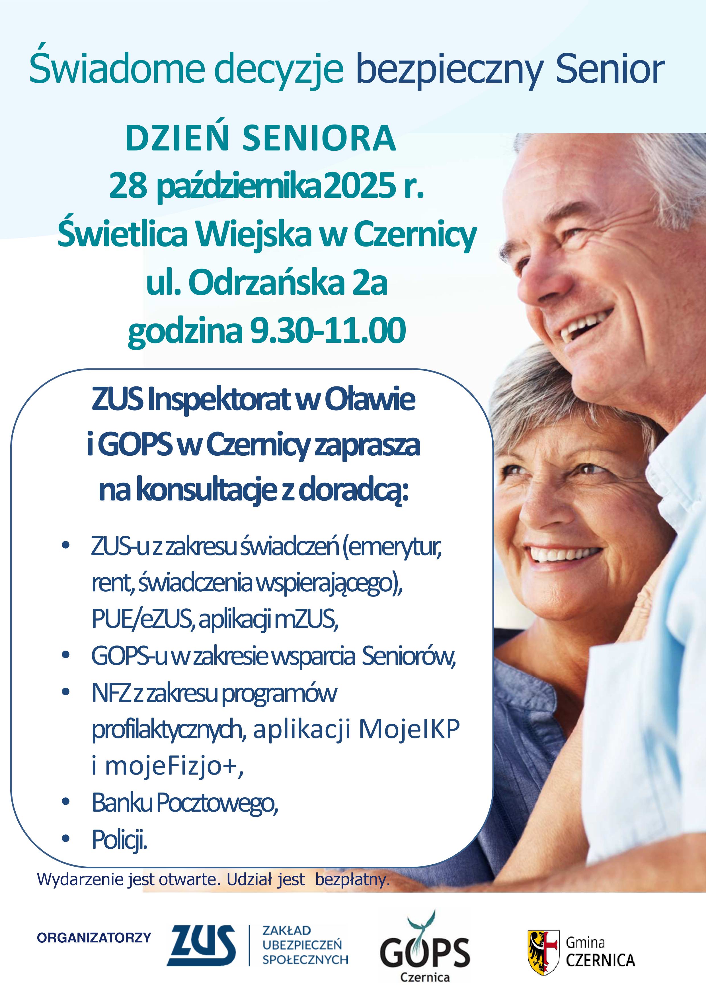 ZUS Inspektorat w Oławie oraz GOPS w Czernicy zapraszają serdecznie Seniorów na spotkanie 28 października o godzinie 9:30 na spotkanie w świetlicy wiejskiej w Czernicy. Będzie to świetna okazja, by zasięgnąć informacji bezpośrednio od doradców, złożyć wnioski, załatwić sprawy formalne… bez jeżdżenia do siedzib instytucji i czekania w długich czasem kolejkach.