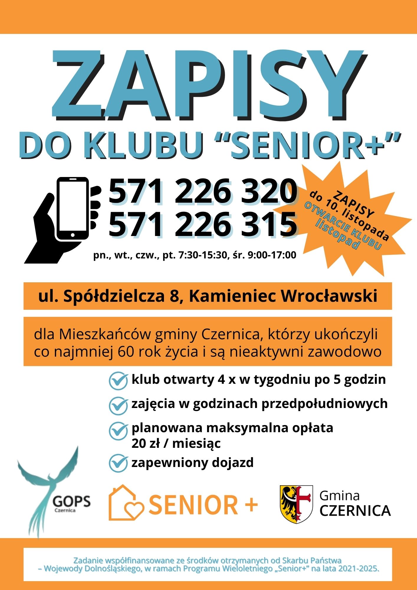 Ogłaszamy zapisy do Klubu „Senior+” w Kamieńcu Wrocławskim. Zapraszamy Seniorów z gminy Czernica, którzy ukończyli co najmniej 60 rok życia i są nieaktywni zawodowo do zgłoszeń telefonicznych: 571 226 320 lub 571 226 315 w godzinach pracy GOPS (pn., wt., czw., pt. 7:30-15:30, śr. 9:00-17:00).