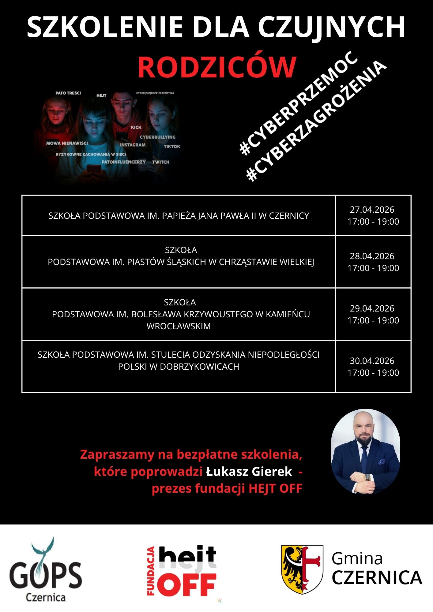 Gminny Ośrodek Pomocy Społecznej w Czernicy we współpracy z wydziałem oświaty gminy Czernica serdecznie zaprasza do udziału w szkoleniu dedykowanym dla rodziców dzieci z terenu gminy Czernica. Szkolenie ma na celu uwrażliwienie na tematy, procedery i przede wszystkim zagrożenia płynące z wielowątkowej cyberprzestrzeni. Szeroko pojęty świat ,,online” jest aktualnym podwórkiem naszych dzieci, które niejednokrotnie nie zapraszają tam swoich rodziców, a niestety można tam znaleźć innych dorosłych –alternatywne autorytety – z nie zawsze właściwymi intencjami. W godzinach lekcyjnych ze szkoleń skorzystają uczniowie oraz członkowie rad pedagogicznych poszczególnych szkół podstawowych z terenu naszej gminy. Natomiast w godzinach od 17:00 do 19:00 drzwi będą otwarte dla rodziców, którzy pragną poszerzyć wiedzę w ww. aspektach. Temat szkolenia dla rodziców jest ten sam każdego dnia, dlatego też jest szansa znalezienia terminu dla siebie najbardziej dogodnego z czterech dostępnych dat: 27.04 (poniedziałek), 28.04 (wtorek), 29.04 (środa), 30.04 (czwartek). Udział w szkoleniu jest bezpłatny. Wydarzenie jest w pełni finansowane z budżetu gminy. Zapraszamy serdecznie. W razie pytań prosimy o kontakt z Gminnym Ośrodkiem Pomocy Społecznej w Czernicy.